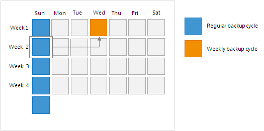 Imagine the weekly backup is scheduled on Wednesday. As all backups are created on Sunday, Veeam Backup & Replication will not find a full backup as of Wednesday. For this reason, it will use the full backup from the next backup copy interval — a full backup as of Sunday.