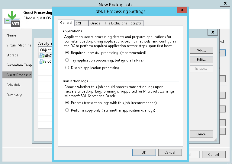 - Select Require successful processing if you want Veeam Backup & Replication to stop the backup process if any error occurs during application-aware processing.