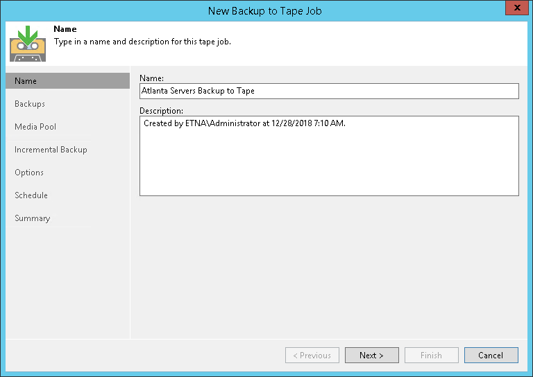 At the Name step of the wizard, you should define basic settings for the backup to tape job.