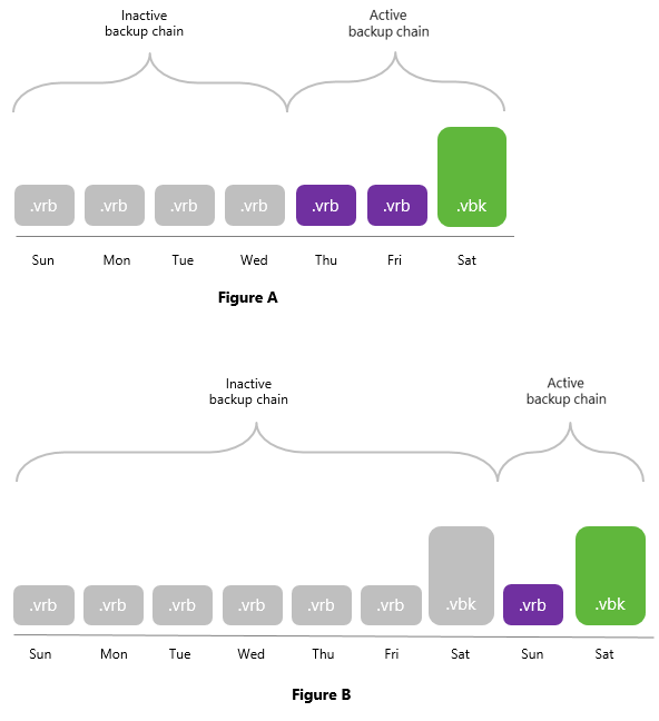 - The Figure B shows a backup chain consisting of 2 .vbk files and 7 .vrb files, of which only 6 .vrb files and a .vbk file (also represented as gray blocks) can be offloaded.