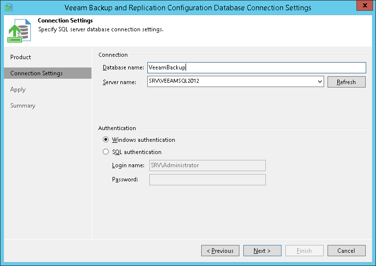 • If you plan to use the Microsoft Windows authentication, consider that the current service account will be used (that is, the account under which the Veeam Backup Service is running).