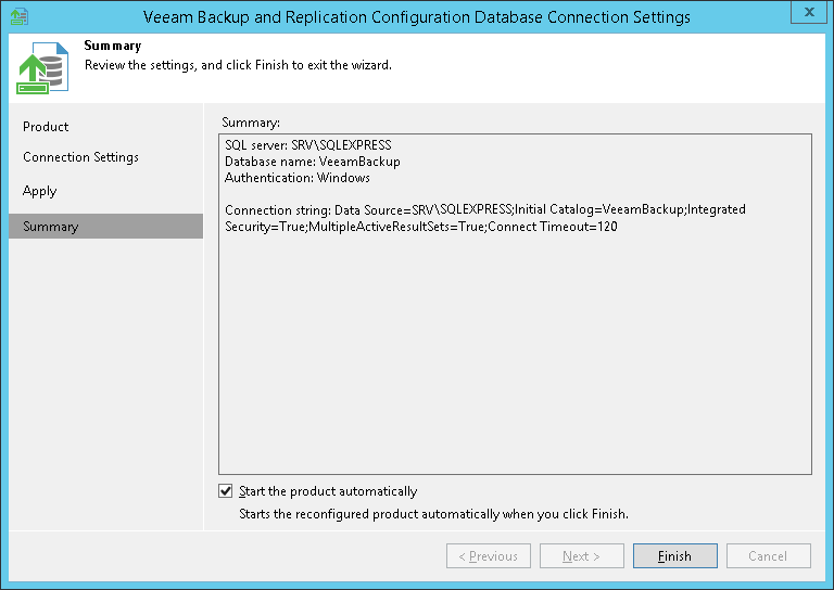At the Summary step of the wizard, view the information about the changes in database connection settings. If you were configuring Veeam Backup & Replication database settings and you want the Veeam backup management console to be open automatically after you finish working with the wizard, select the Start the product automatically check box.