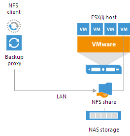 In the Direct NFS access mode, Veeam Backup & Replication bypasses the ESXi host and reads/writes data directly from/to NFS datastores. To do this, Veeam Backup & Replication deploys its native NFS client on the backup proxy and uses it for VM data transport. VM data still travels over LAN but there is no load on the ESXi host.