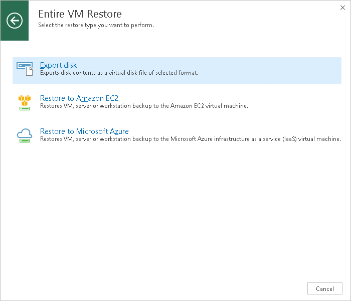 This is an archive version of the document. To get the most up-to-date information, see the current version. Step 1. Launch Export Disk Wizard To launch the Export Disk wizard, do the following:Open the Home tab.Click Restore > Amazon EC2 > Entire machine restore > Export disk.