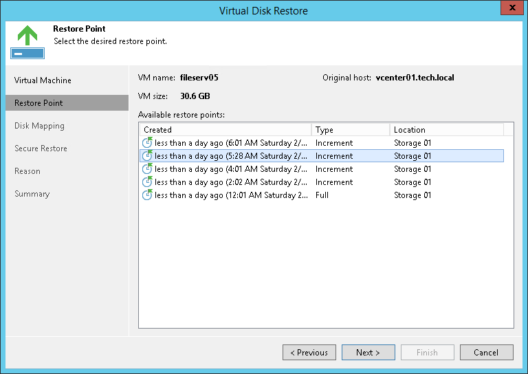 At the Restore Point step of the wizard, select the restore point from which you want to restore the VM disks.