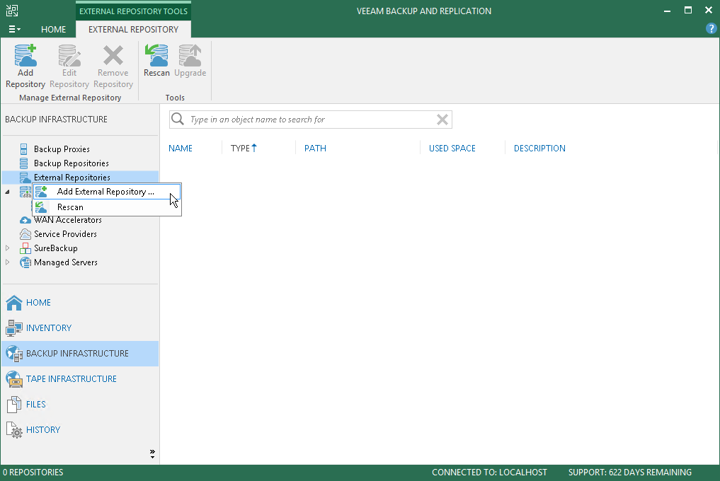 - Open the Backup Infrastructure view, in the inventory pane select the External Repositories node and click Add Repository on the ribbon.