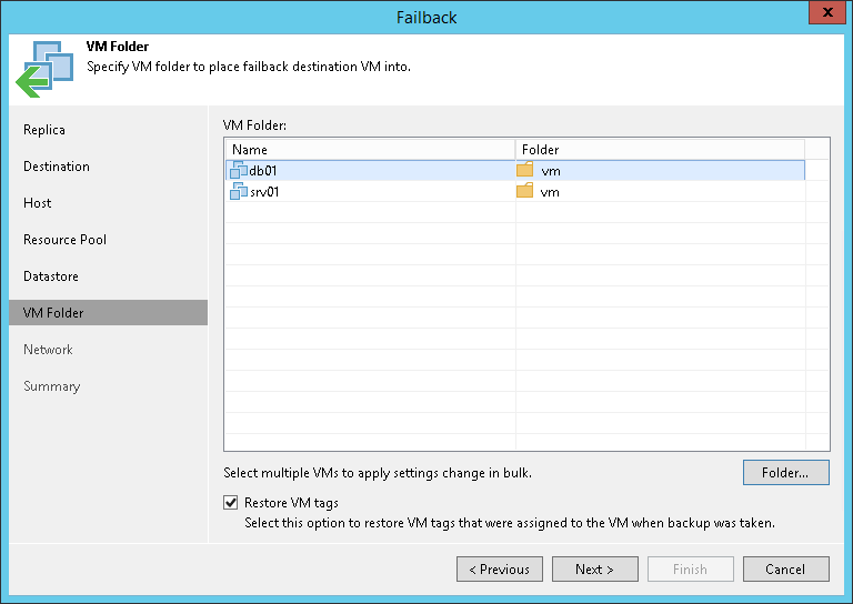 The VM Folder step of the wizard is only available if you have chosen to perform advanced failback.