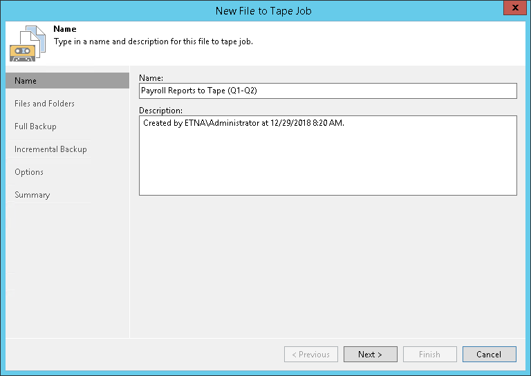 At the Name step of the wizard, you should define basic settings for the created file to tape job.