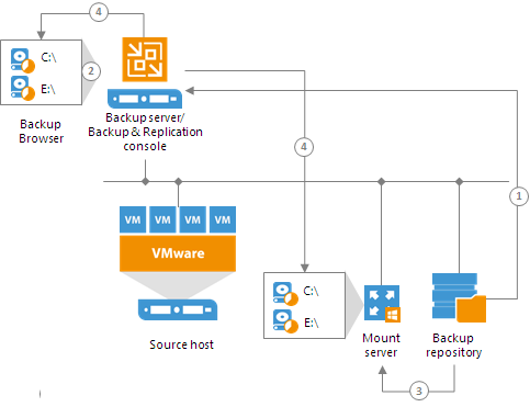 - When the restore process is finished or the Veeam Backup browser is closed by timeout, Veeam Backup & Replication removes mount points from the backup server or machine on which the Veeam Backup & Replication console is installed and from the mount server (if the second mount was used).