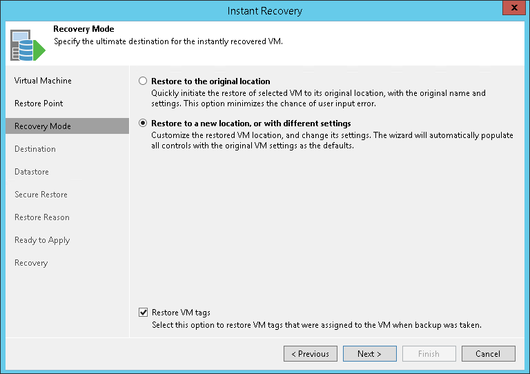 - Select Restore to a new location, or with different settings if you want to restore the VM to a different location and/or with different settings (such as VM location, network settings, format of restored virtual disks and so on). If this option is selected, the Instant Recovery wizard will include additional steps for customizing VM settings.