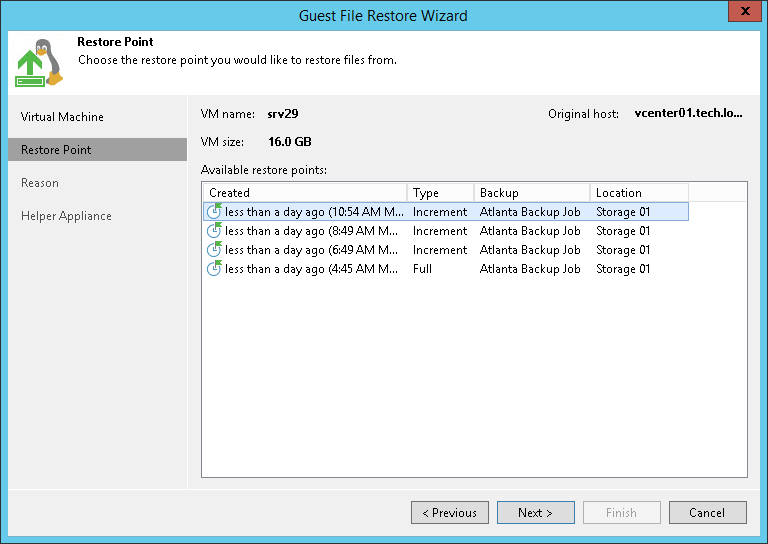 At the Restore Point step of the wizard, select the restore point from which you want to restore VM guest OS files.