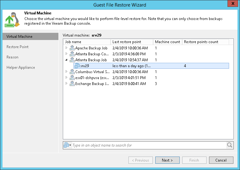 At the Virtual Machine step of the wizard, select the VM whose guest OS files you want to restore: