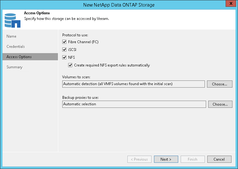 - [For NetApp storage system working over NFS] During storage rescan, backup and restore operations, Veeam Backup & Replication automatically creates required NFS export rules on the storage system. If you do not want Veeam Backup & Replication to create export rules, clear the Create required NFS export rules automatically check box.