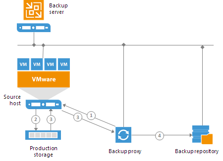 - Veeam Backup & Replication instructs VMware vSphere to create a VMware vSphere VM snapshot, copies VM data blocks from the source storage and sends them to the backup proxy over LAN.