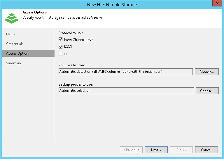 - Operations of storage rescan and Backup from Storage Snapshots are performed with the help of a backup proxy. On the right of the Backup proxies to use field, click Choose and define backup proxies that you want to use for these operations.