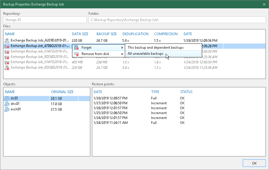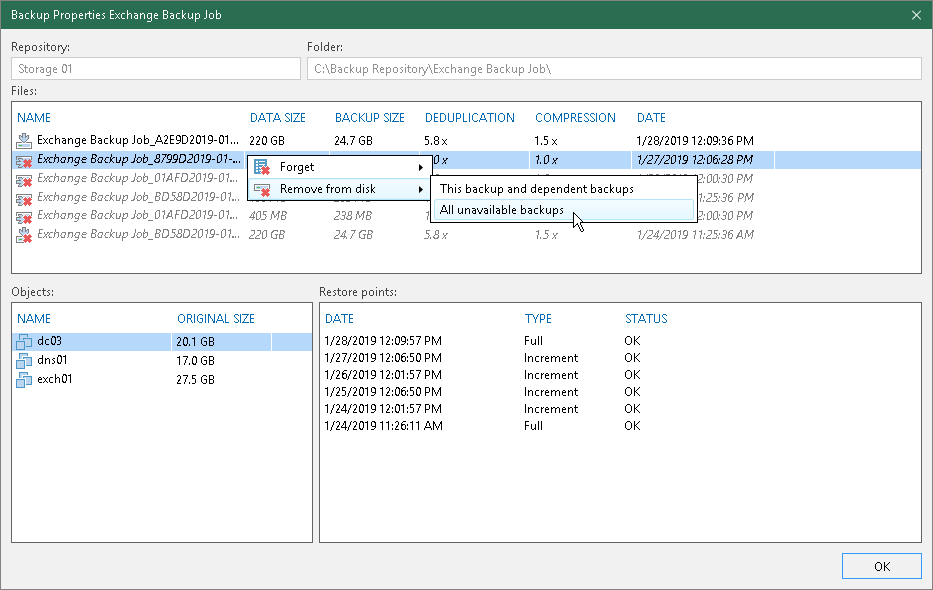 - Remove — you can remove records about missing restore points from the configuration database and delete backup files from disk (if backup files are still available).