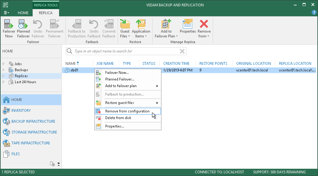 - The Remove from configuration operation can be performed only for VM replicas in the Ready state. If the VM replica is in the Failover or Failback state, this option is disabled.