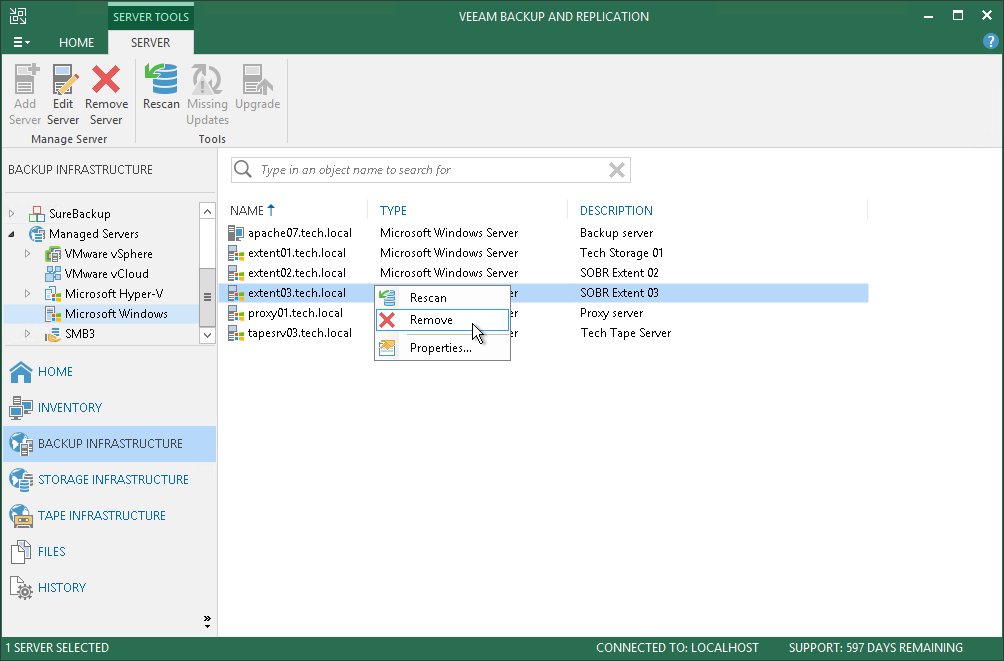 When you remove a server that is used as a target host or backup repository, backup files and replica files are not removed from disk. You can easily import these files later to Veeam Backup & Replication if needed.