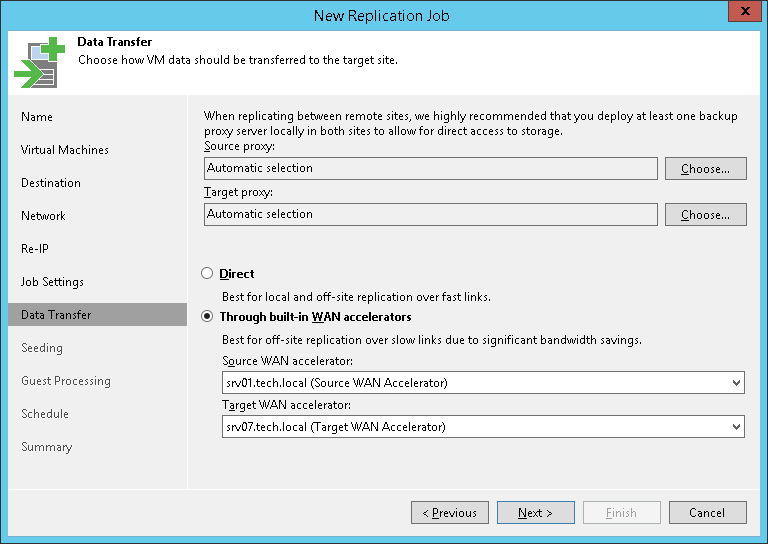 At the Data Transfer step of the wizard, select backup infrastructure components that must be used for the replication process and choose a path for VM data transfer.