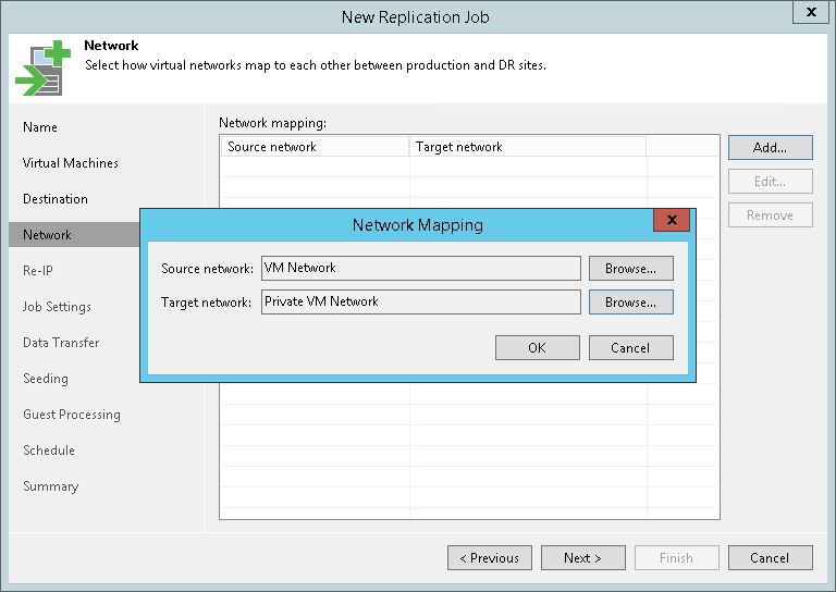 The Network step of the wizard is available if you have selected the Separate virtual networks option at the Name step of the wizard. You can use this step to configure network mapping settings for the VM replicas.