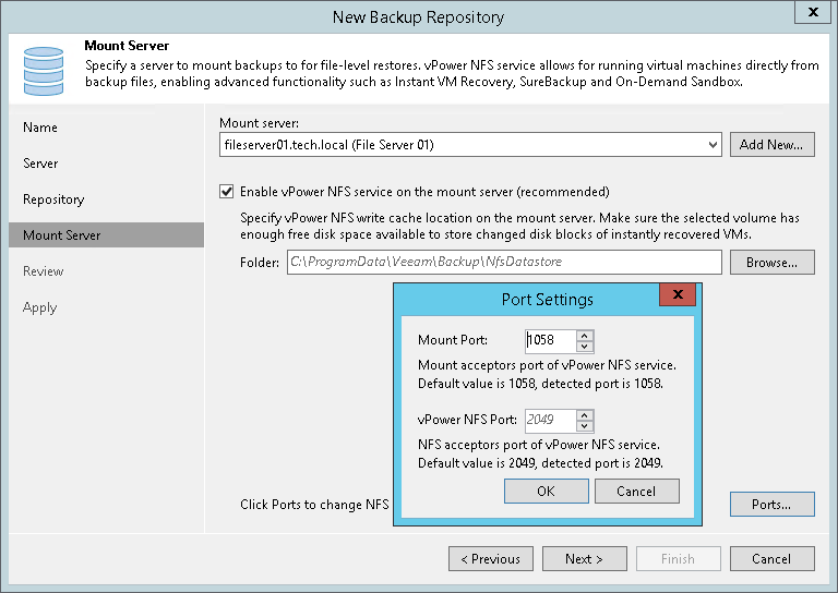 - To make the backup repository accessible by the Veeam vPower NFS Service, select the Enable vPower NFS server on the mount server check box. Veeam Backup & Replication will enable the vPower NFS Service on the mount server you have selected.