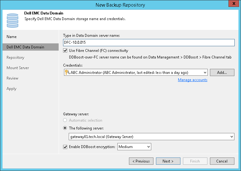 If you connect to Dell EMC Data Domain over Fibre Channel, you must explicitly define the gateway server to communicate with Dell EMC Data Domain. The server you select must be added to the backup infrastructure and must have access to the Dell EMC Data Domain appliance over Fibre Channel. |