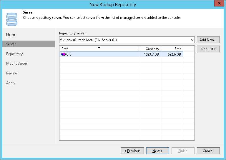 - From the Repository server list, select a Microsoft Windows or Linux server that you want to use as a backup repository. The Repository server list contains only those servers that are added to the backup infrastructure. If the server is not added to the backup infrastructure yet, you can click Add New on the right to open the New Windows Server or New Linux Server wizard.