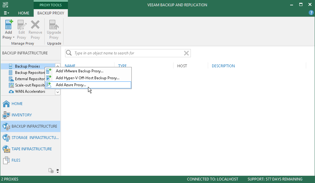 - Open the Backup Infrastructure view. In the inventory pane, select Backup Proxies, click the Backup Proxy node, and click Add Proxy > Azure on the ribbon.