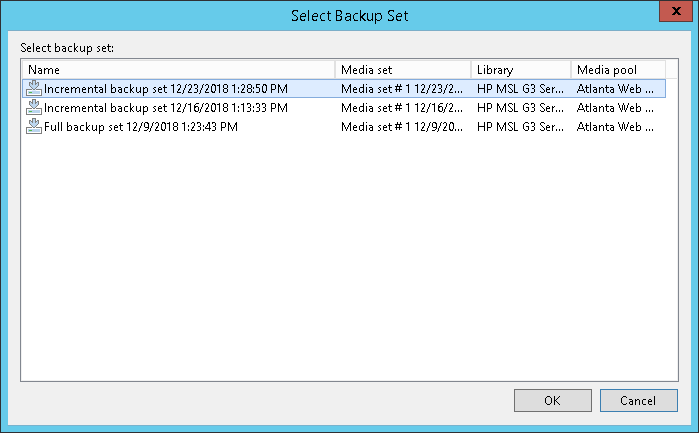 By default, Veeam Backup & Replication will restore the latest version of files available on tape. If you want to restore files from another restore point, select the necessary file and click Backup Set. In the list of available backup sets, select the necessary archiving session and click OK.