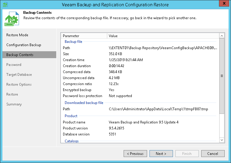 At the Backup Contents step of the wizard, Veeam Backup & Replication will analyze the content of the selected backup file and display the following settings: