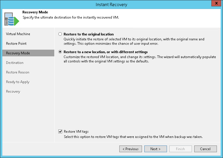 - Select Restore to a new location, or with different settings if you want to restore the VM to a different location and/or with different settings. If you select this option, the Instant Recovery wizard will include additional steps for customizing VM settings.