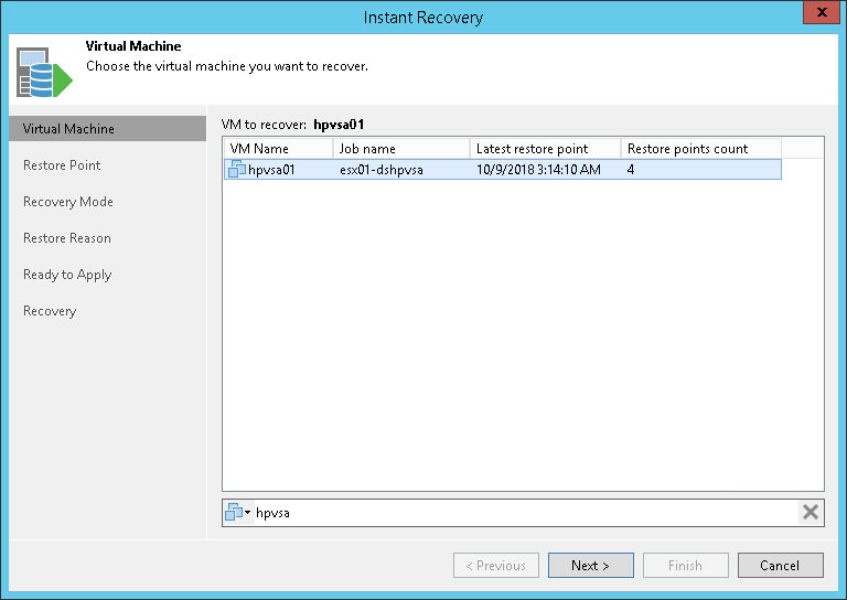 At the Virtual Machine step of the wizard, select a VM that you want to restore.