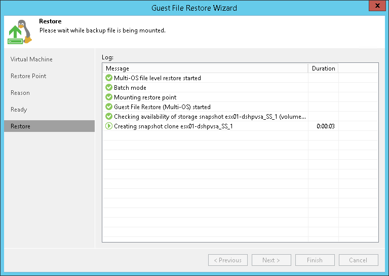 This is an archive version of the document. To get the most up-to-date information, see the current version. Step 6. Start Restore Process At the Restore step of the wizard, check the progress of the restore process. The file-level restore appliance may take about 10-20 seconds to boot.