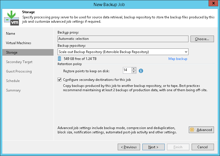 - Configure a backup job. At the Storage step of the backup job wizard, select a backup proxy that will be used for data transport. You can assign the backup proxy explicitly or choose the automatic mode of backup proxy selection.