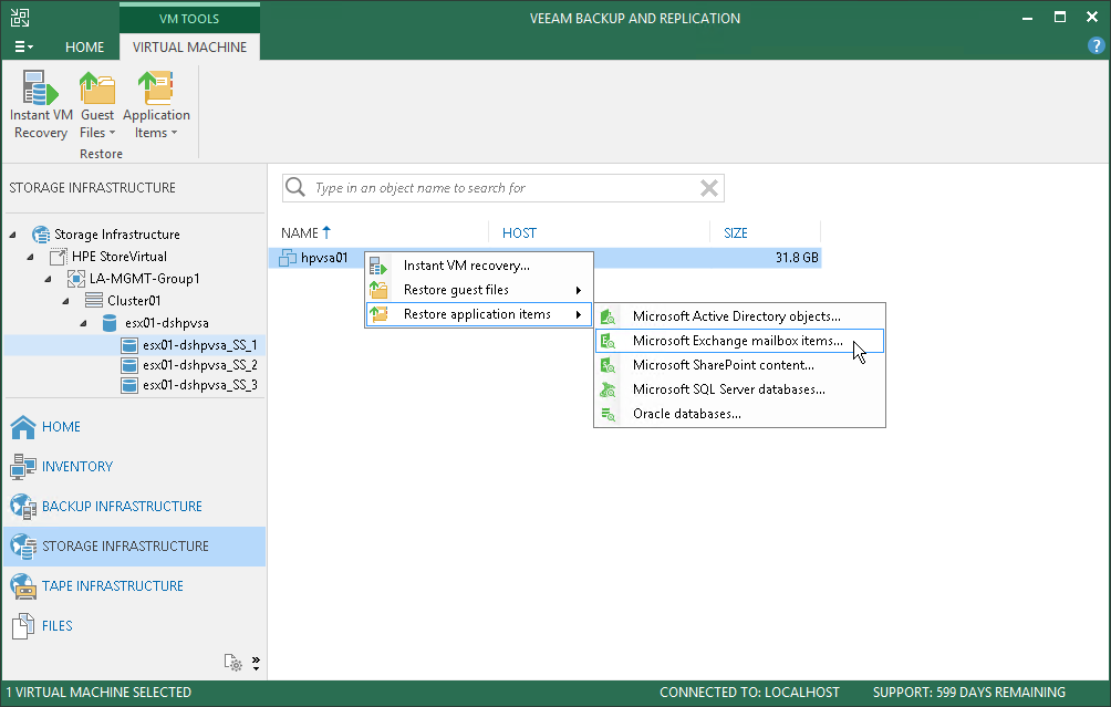 - Open the Storage Infrastructure view. In the inventory pane, select the necessary volume snapshot. In the working area, select a VM running Microsoft Exchange and click Application Items > Microsoft Exchange on the ribbon. You can also right-click the VM and select Restore application items > Microsoft Exchange mailbox items. In this case, you will pass immediately to the Location step of the wizard.