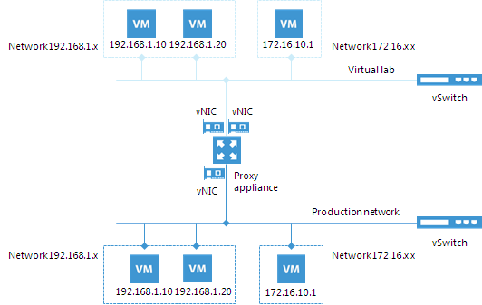 In the advanced single-host virtual lab, Veeam Backup & Replication creates several virtual networks for the virtual lab. The number of virtual networks corresponds to the number of production networks to which verified VMs are connected. Networks in the virtual lab are mapped to production networks.