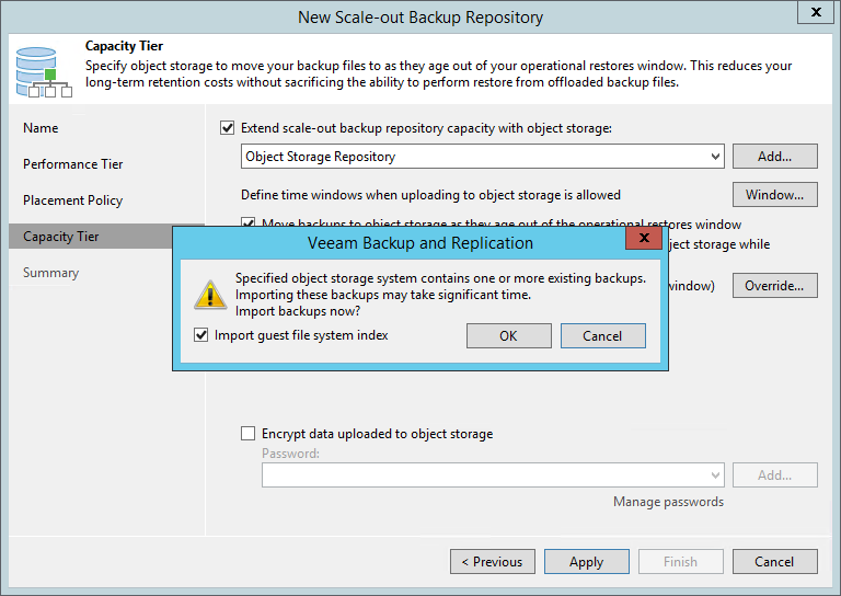 When you add an object storage repository that already contains offloaded data, you will be prompted to synchronize this data with your extents.