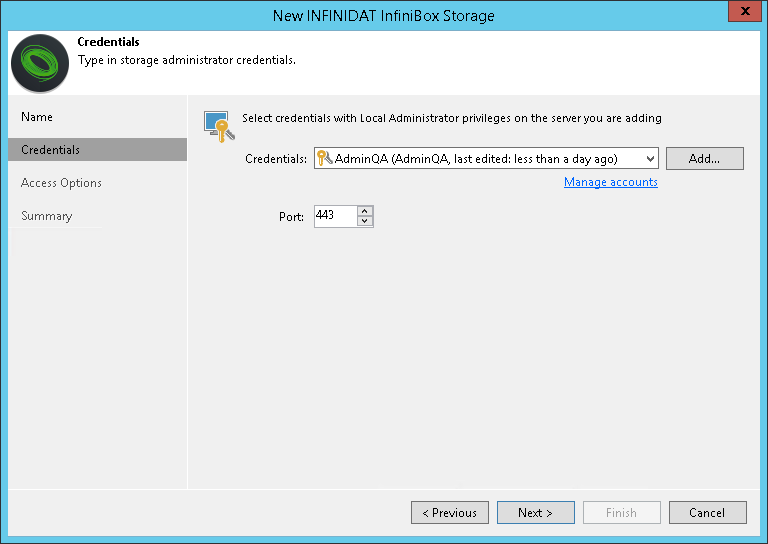 - From the Credentials list, select credentials to connect to the storage system. If you have not set up credentials beforehand, click the Manage accounts link or click Add on the right of the Credentials field to add the credentials. For more information, see Managing Credentials.