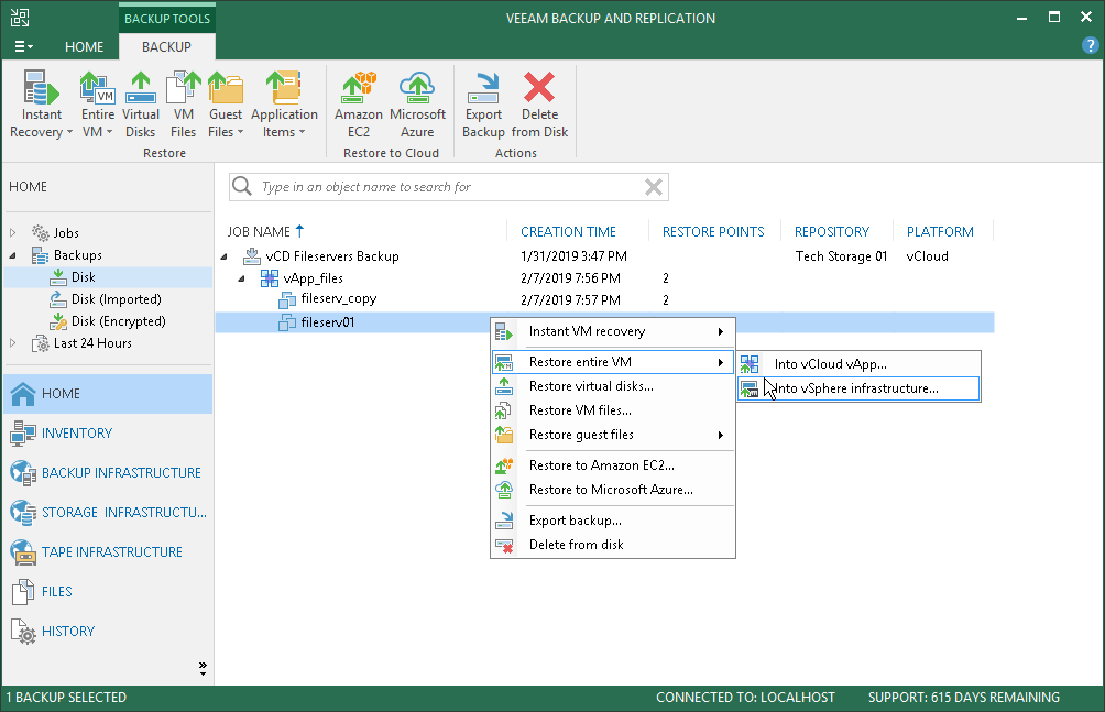- Open the Home view, in the inventory pane select Backups. In the working area, expand the necessary backup, select the VMs you want to restore and click Entire VM > Into vSphere infrastructure on the ribbon.