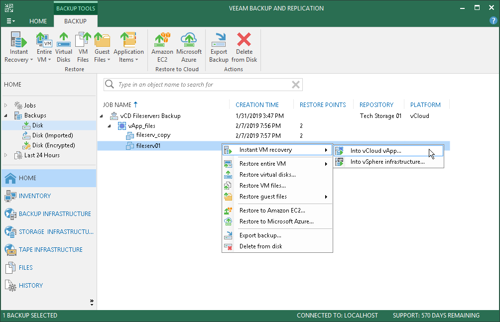 - Select the machine that you want to restore and click Instant VM Recovery > Into vCloud vApp on the ribbon.