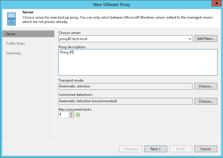 - From the Choose server list, select a Microsoft Windows server to which you want to assign the backup proxy role. If the server is not added to the backup infrastructure yet, you can click Add New to open the New Windows Server wizard. For more information, see Adding Microsoft Windows Servers.