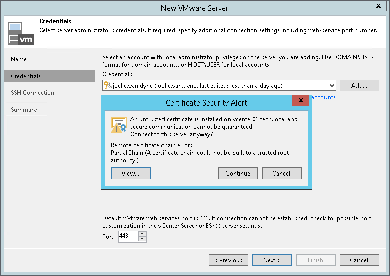If the certificate installed on the server is not trusted, Veeam Backup & Replication displays a warning.