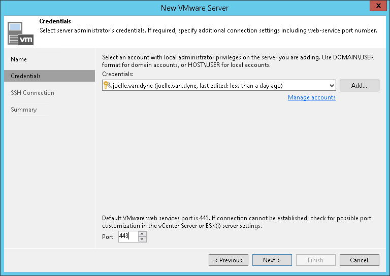 At the Credentials step of the wizard, specify credentials and port settings for the VMware vSphere server.