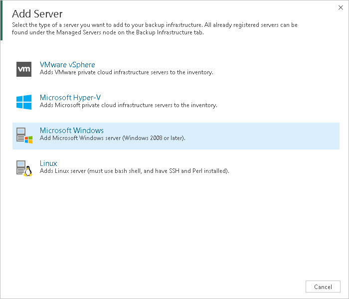 - Open the Backup Infrastructure view. In the inventory pane, select the Managed Servers node and click Add Server on the ribbon or right-click the Managed Servers node and select Add Server. In the Add Server window, select Microsoft Windows.