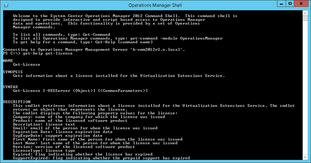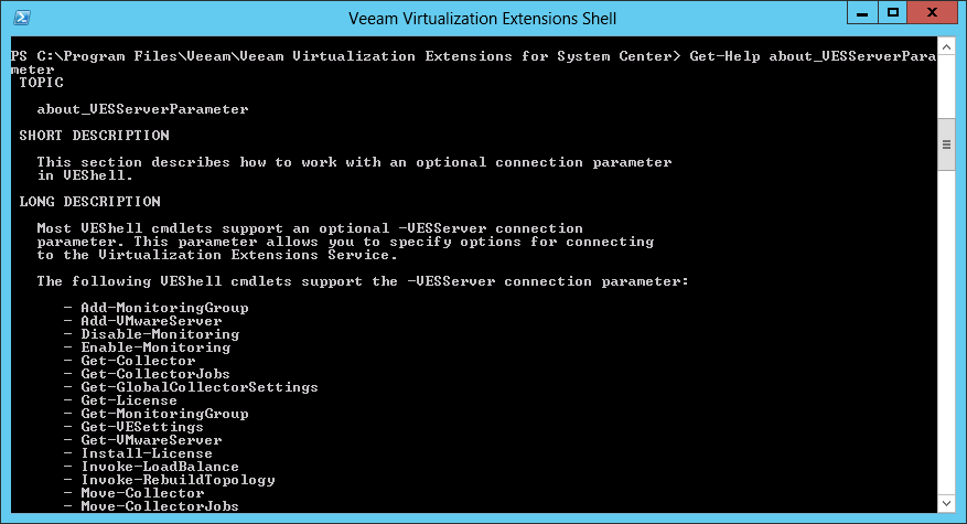 Veeam Virtualization Extensions Shell includes console-based help for each cmdlet. To get a cmdlet description, you can use the Windows PowerShell Get-Help cmdlet.