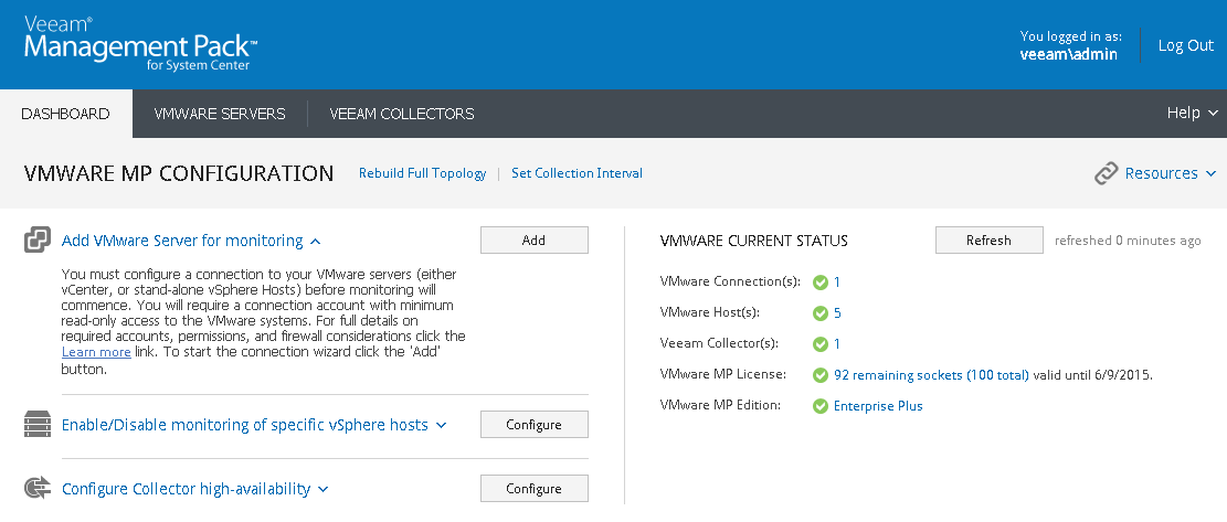 This is an archive version of the document. To get the most up-to-date information, see the current version. Step 4. Review Dashboard The Dashboard will appear as shown below: There is 1 VMware connection, consisting of 5 hosts, in green state.There is 1 Active Collector, in green state.The license is valid with 92 of 100 sockets remaining.Click the VMware Servers tab to review the vCenter Server target status.