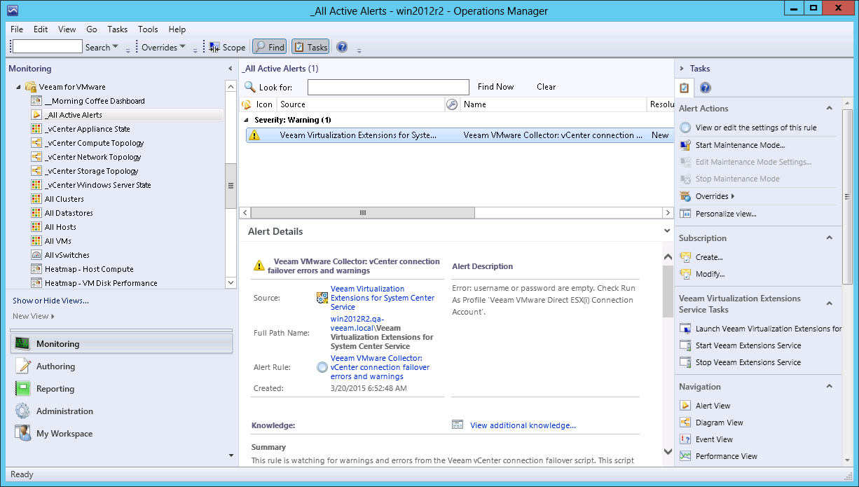 After you install the Veeam MP for VMware components, the Veeam VMware Collector: vCenter connection failover errors and warnings alert will be fired in the Ops Mgr console: