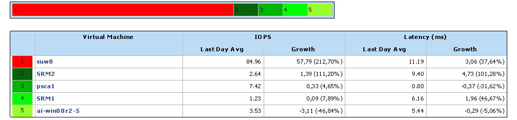 It can be seen from the report output that there are 5 VMs on the selected datastore, but only VM #1 is colored red, as its average number of IOPS exceeded the specified 30% threshold.
