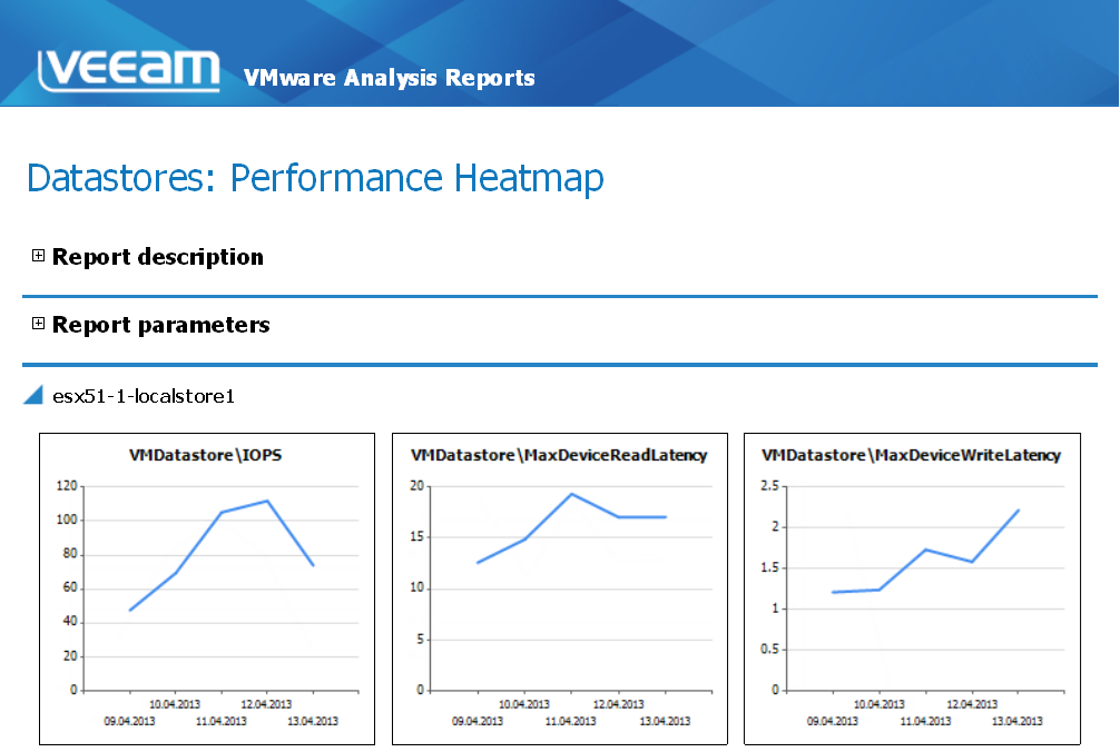 You can click a VM name, a datastore name or a cell on the Heat Map to drill down to the Veeam Performance Details Report from the Veeam Report Library.