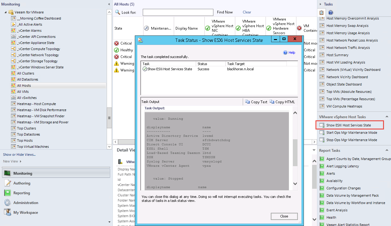 The Show ESXi Host Services State task is designed to show all running and stopped ESX host services. If you need to monitor the state of a specific service, you can create and customize a vSphere Host Service Monitor using information provided by this task.